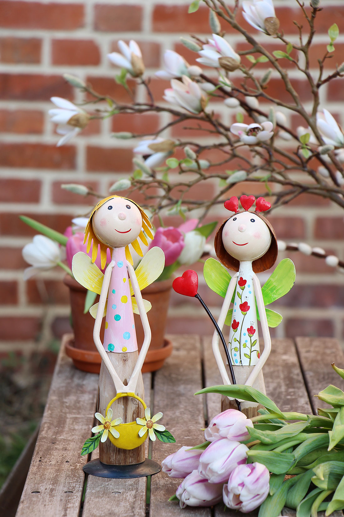 Ihr sucht einen wunderschönen Blickfang für Eure Frühlingsdeko? Dann solltet Ihr unsere Figur FRÜHLINGSFEE kennenlernen. Ihr erhaltet die Figur in mehreren Varianten. Alle wurden aus Metall und Eukalyptusholz gefertigt und mit viel Liebe zum Detail bemalt und gestaltet. In ihren Händen entdeckt Ihr kleine Frühlingsboten.